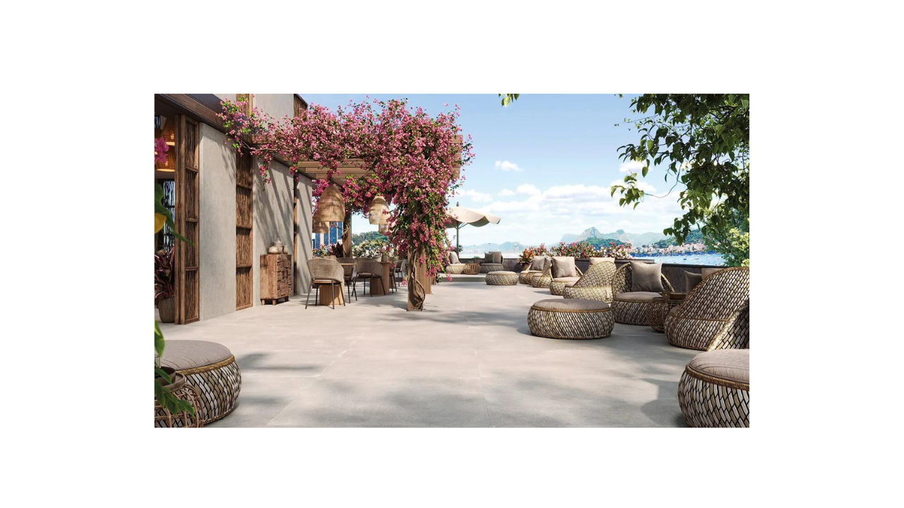 Terras gemaakt met XLIGHT Bottega Acero grijze porseleinen tegels van Porcelanosa.