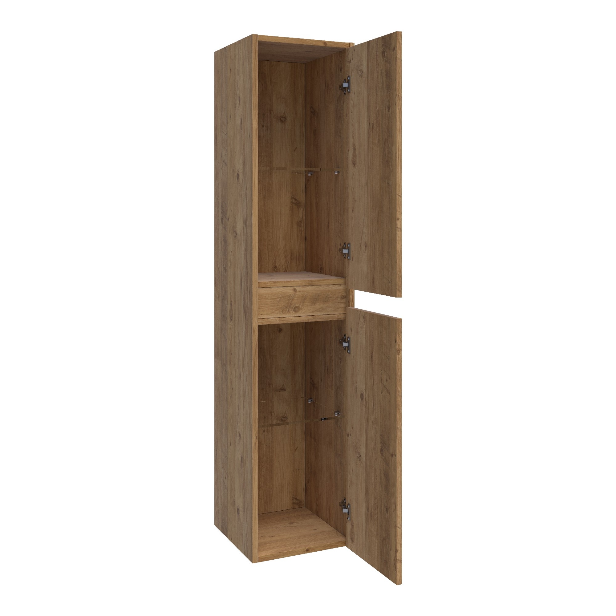 Deze hoge kast, met zijn compacte maar verrassend ruime opzet, biedt de ideale oplossing voor het opbergen van al je badkameraccessoires. De greeploze deuren met softclose scharnieren maken elke interactie een fluisterstille ervaring. Het is een meesterwerk van gebruiksgemak en esthetiek.