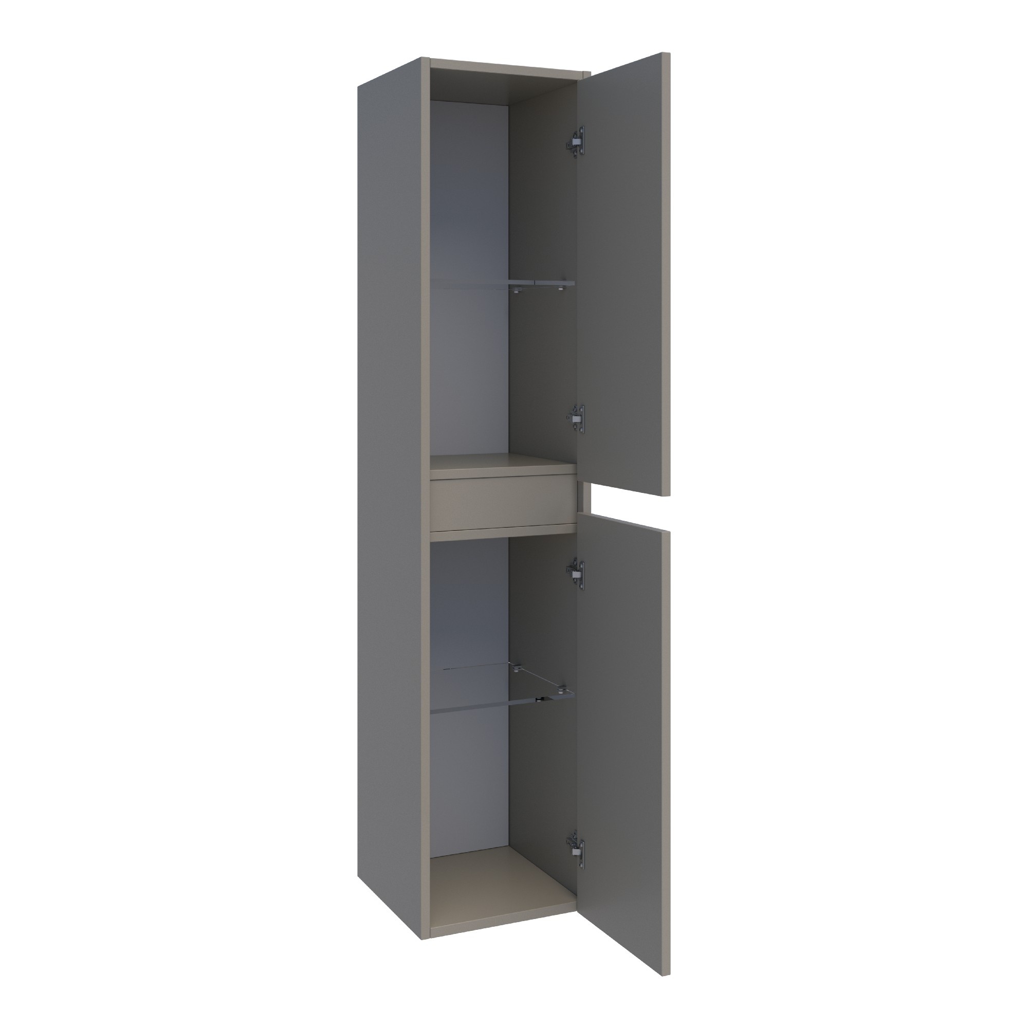 De Brauer Adore kast, uitgevoerd in MDF met een krasvaste en vochtbestendige toplaag, is ideaal voor de vochtige omgeving van de badkamer. Met twee glazen legplanken biedt deze hoge kast ruimte en organisatie, terwijl de greeploze deuren zorgen voor een naadloze look. Het hangende ontwerp houdt de vloer vrij en draagt bij aan een opgeruimde uitstraling.
