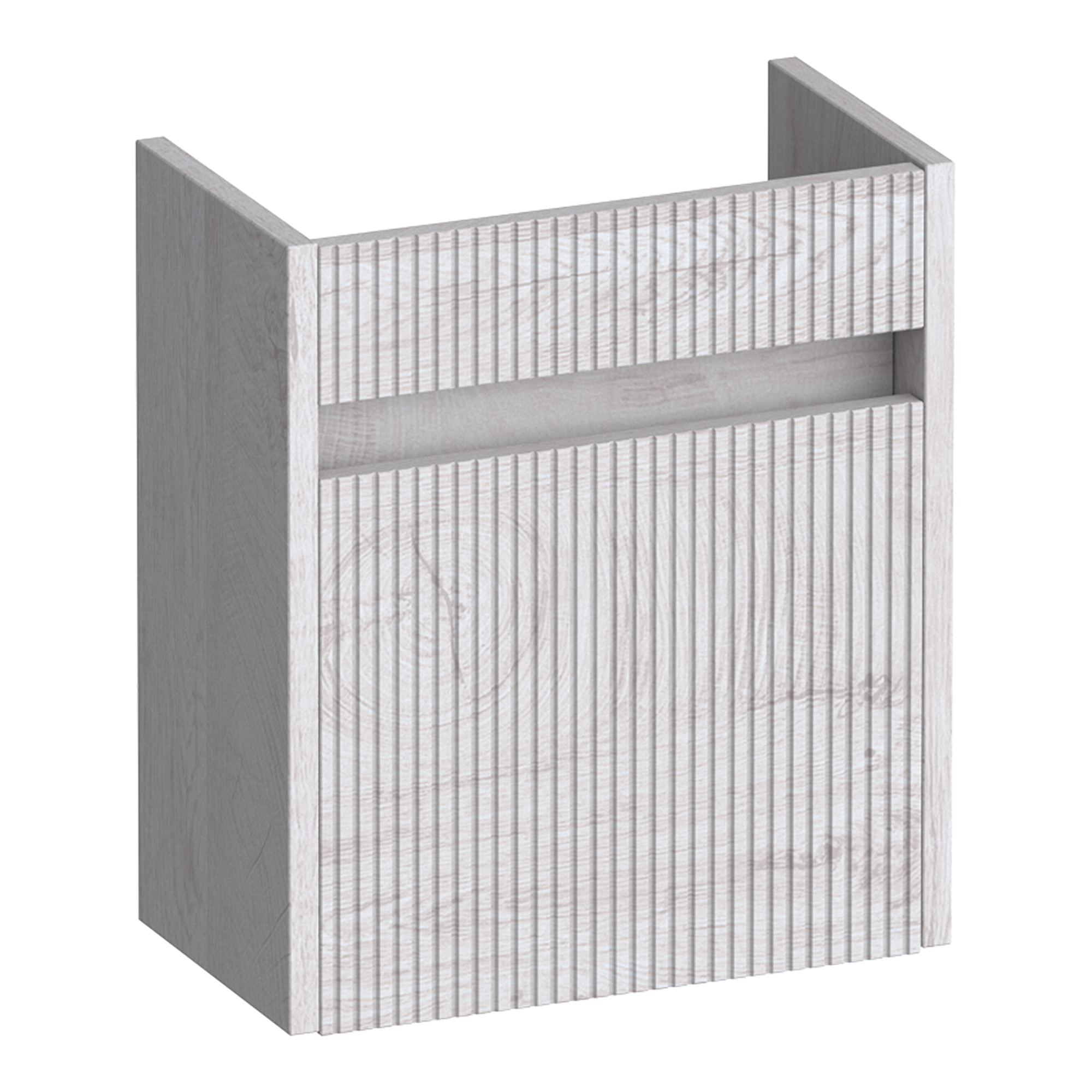De kast biedt een greeploos ontwerp met een stijlvol ribbelpatroon dat moeiteloos in iedere badkameromgeving past. De deur is rechtsdraaiend, wat zorgt voor een praktische toegang. Soft-close scharnieren maken het dagelijks gebruik een genot, zonder storend geluid.