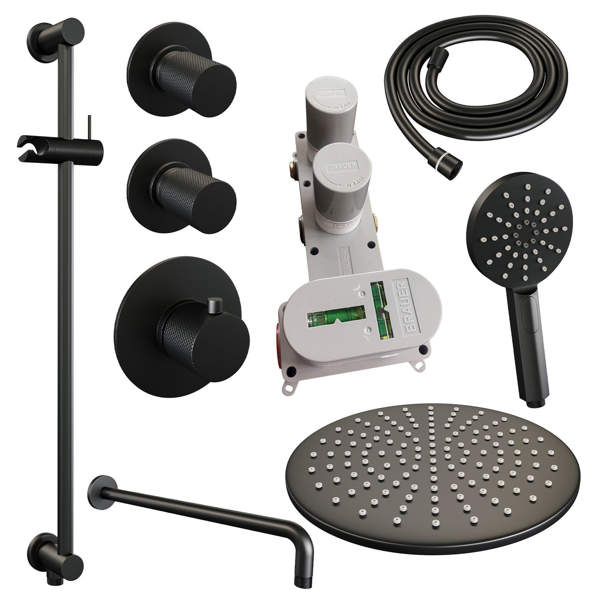 Brauer Black Carving Regendouchesets inbouw - hoofddouche 30cm - Wandarm - glijstang - met inbouwdeel - 3 Carving knoppen - handdouche Rond 1 stand - mat zwart