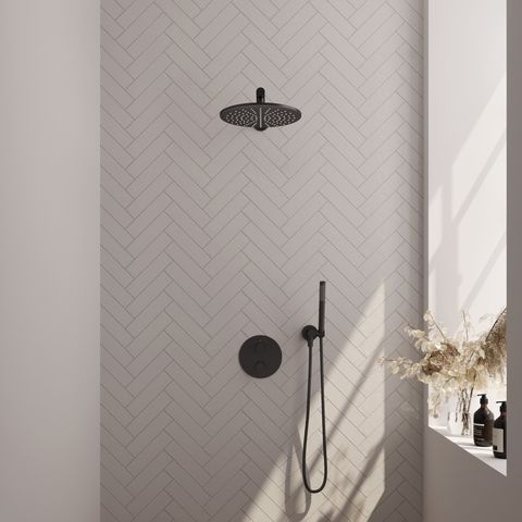 De set is uitgevoerd in mat zwart en gemaakt van messing. Dit materiaal staat bekend om zijn stevigheid en is geschikt voor gebruik in vochtige ruimtes. De mat zwarte afwerking geeft het geheel een moderne uitstraling, maar kan wel gevoeliger zijn voor krassen; extra voorzichtig schoonmaken is aan te raden. De set bestaat uit een 30 cm ronde hoofddouche, een rechte muurarm, een staaf handdouche, een flexibele doucheslang en een wandaansluitbocht. De thermostatische bediening zorgt ervoor dat je eenvoudig de gewenste temperatuur instelt en deze constant blijft tijdens het douchen. Het inbouwdeel is inbegrepen, wat betekent dat je geen losse onderdelen hoeft aan te schaffen voor de installatie. Deze set is verkrijgbaar in meerdere afwerkingen: chroom, geborsteld goud PVD, geborsteld gunmetal PVD, geborsteld koper PVD, geborsteld RVS PVD en mat zwart.