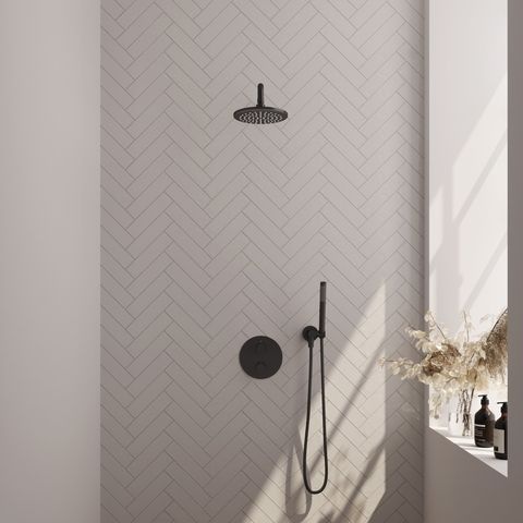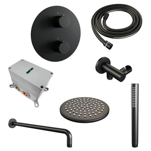 De set is uitgevoerd in mat zwart, wat zorgt voor een eigentijdse en rustige afwerking. Het materiaal is messing, wat bekend staat om zijn stevigheid en bestendigheid tegen vocht. De matzwarte afwerking kan wel krasgevoeliger zijn, dus voorzichtig onderhoud is aan te raden. De set bevat een thermostaat waarmee je eenvoudig een constante watertemperatuur instelt. Het inbouwdeel is inbegrepen, wat betekent dat je alle techniek netjes in de muur kunt wegwerken. De set is verkrijgbaar in meerdere kleuropties: chroom, geborsteld goud PVD, geborsteld gunmetal PVD, geborsteld koper PVD, geborsteld RVS PVD en mat zwart. De set heeft geen verschillende straalsoorten en wordt zonder glijstang geleverd.