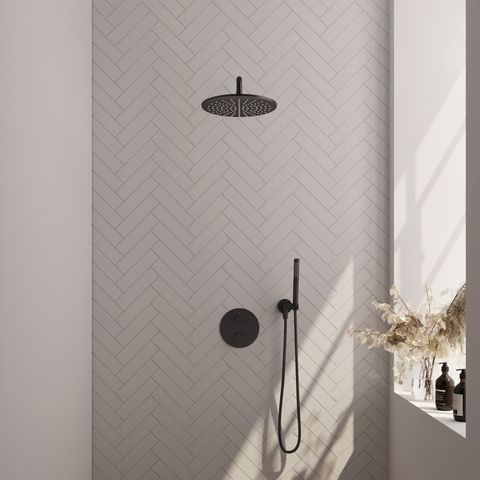 De set is uitgevoerd in mat zwart en gemaakt van duurzaam messing. Dit materiaal is stevig en wordt veel gebruikt in sanitair. De afwerking in mat zwart geeft een eigentijdse uitstraling, maar het oppervlak kan gevoeliger zijn voor krassen; voorzichtig schoonmaken is daarom aan te raden. De set bestaat uit een ronde hoofddouche van 30 cm, een gebogen muurarm, een staaf handdouche, een flexibele doucheslang en een wandaansluitbocht. De bediening verloopt via een thermostatische inbouwkraan met drie standen, zodat je eenvoudig schakelt tussen de verschillende functies. Er zijn geen verschillende straalsoorten beschikbaar en het is niet mogelijk om meerdere wateruitgangen tegelijk te gebruiken. Deze doucheset is ook verkrijgbaar in andere afwerkingen, zoals chroom, geborsteld goud PVD, geborsteld gunmetal PVD, geborsteld koper PVD en geborsteld RVS PVD.