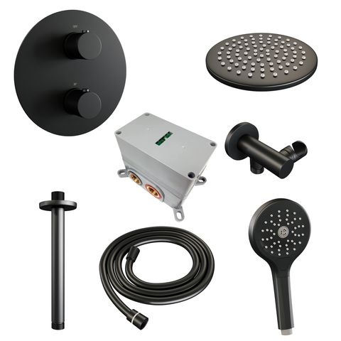 De set bestaat uit een ronde hoofddouche van 20 cm met plafondarm, een handdouche met drie straalsoorten, een doucheslang en een wandaansluitbocht. De bediening verloopt via een thermostaat die zorgt voor een constante watertemperatuur. Het product is gemaakt van messing, een materiaal dat bekendstaat om zijn stevigheid en kwaliteit. De mat zwarte afwerking geeft een moderne uitstraling, maar is wel gevoeliger voor krassen dan sommige andere afwerkingen. Deze doucheset is verkrijgbaar in meerdere kleuren: chroom, geborsteld goud PVD, geborsteld gunmetal PVD, geborsteld koper PVD, geborsteld RVS PVD en mat zwart. Het inbouwdeel wordt meegeleverd, waardoor je alles compleet hebt voor montage. Houd er rekening mee dat deze set zonder glijstang wordt geleverd en dat je niet meerdere wateruitgangen tegelijk kunt gebruiken.