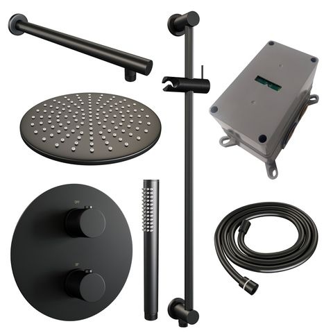 De set is uitgevoerd in een trendy mat zwarte kleur, wat goed past in moderne badkamers. Het materiaal is messing, wat bekend staat om zijn kwaliteit. Je krijgt een grote, ronde hoofddouche en een praktische handdouche, die je dankzij de geïntegreerde glijstang makkelijk in hoogte verstelt. De thermostaat zorgt ervoor dat de watertemperatuur constant blijft tijdens het douchen. Het inbouwdeel wordt meegeleverd, zodat je direct aan de slag kunt met de montage. Houd er rekening mee dat mat zwart wat gevoeliger is voor krassen; voorzichtig onderhoud is dus belangrijk. Naast mat zwart is deze set ook verkrijgbaar in chroom, geborsteld goud PVD, geborsteld gunmetal PVD, geborsteld koper PVD en geborsteld RVS PVD. Zo kun je de afwerking kiezen die het beste bij jouw badkamer past.