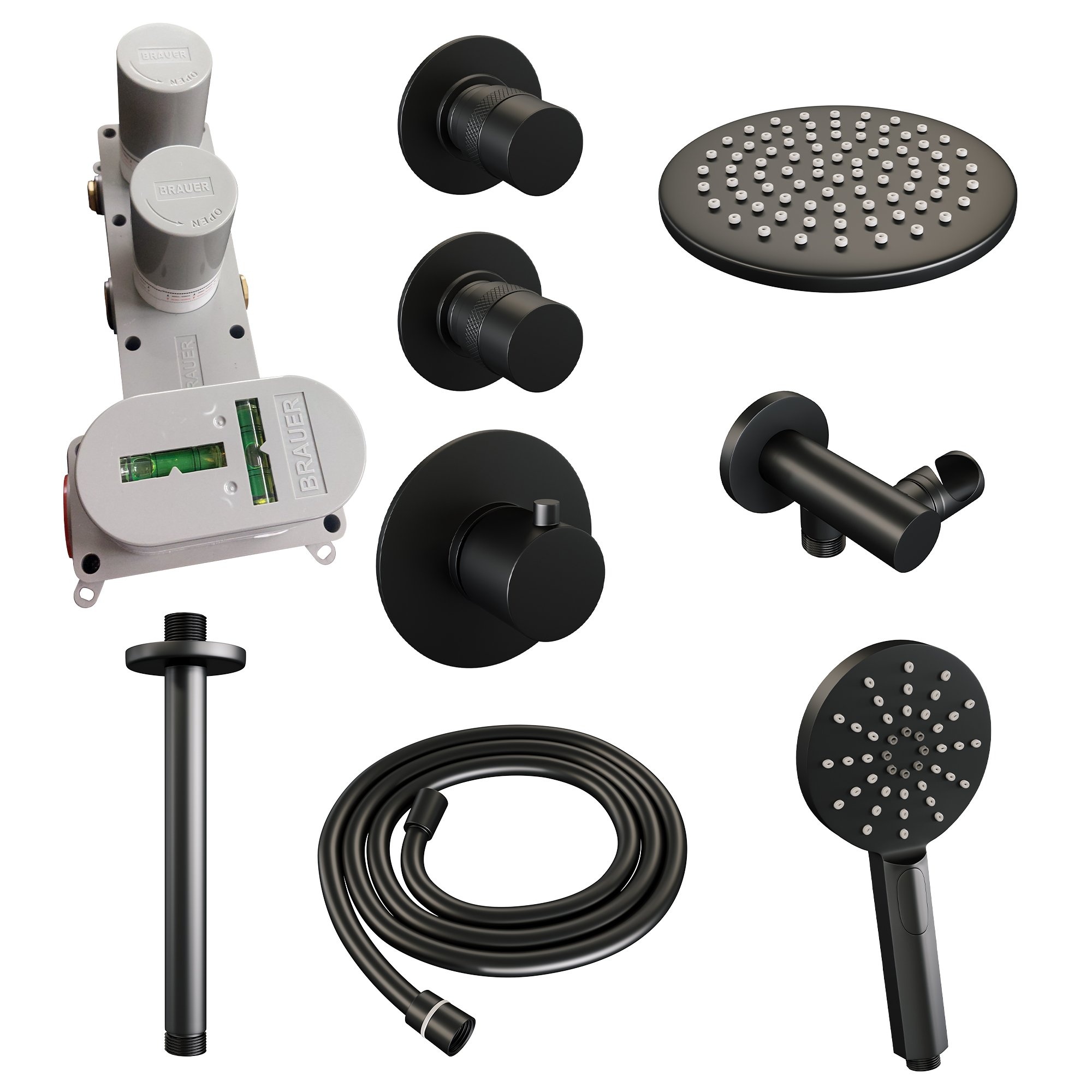 Brauer Black Edition thermostatische inbouw regendouche SET 11 met 20 cm douchekop en plafondarm en 3-standen handdouche en doucheslang en wandaansluitbocht mat zwart