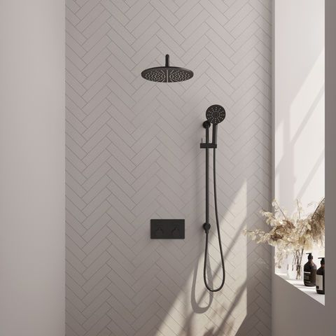 De set is uitgevoerd in mat zwart, wat zorgt voor een eigentijdse look. De onderdelen zijn gemaakt van messing, wat bekend staat om zijn duurzaamheid. Je bedient de douche via drukknoppen, waarmee je makkelijk tussen de regendouche en handdouche schakelt. De handdouche heeft drie straalsoorten, zodat je zelf kiest wat prettig voelt. De thermostaat zorgt ervoor dat het water op een constante temperatuur blijft. Dankzij de geïntegreerde glijstang kun je de handdouche flexibel plaatsen. Het inbouwdeel wordt meegeleverd, wat het geheel compleet maakt. Deze set is verkrijgbaar in verschillende afwerkingen, zoals chroom, geborsteld goud PVD, geborsteld gunmetal PVD, geborsteld koper PVD en geborsteld RVS PVD, naast mat zwart.
