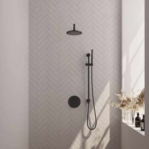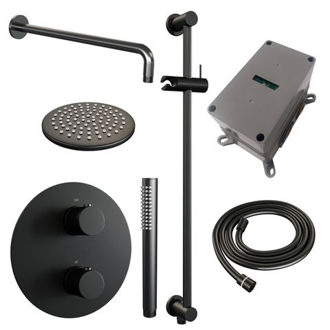 De set is uitgevoerd in mat zwart en gemaakt van kwalitatief messing. Dit materiaal is stevig en wordt veel gebruikt in sanitair vanwege zijn duurzaamheid. De matzwarte afwerking geeft een moderne uitstraling, maar kan gevoeliger zijn voor krassen; voorzichtig onderhoud is daarom aan te raden. De set bestaat uit een ronde hoofddouche van 20 cm, een gebogen muurarm, een staaf handdouche, een flexibele doucheslang en een geïntegreerde glijstang. De thermostaat zorgt voor een constante watertemperatuur. Het inbouwdeel is inbegrepen, waardoor je alle onderdelen netjes in de muur verwerkt. Deze doucheset is verkrijgbaar in meerdere afwerkingen: Chroom, Geborsteld goud PVD, Geborsteld gunmetal PVD, Geborsteld koper PVD, Geborsteld RVS PVD en mat zwart.