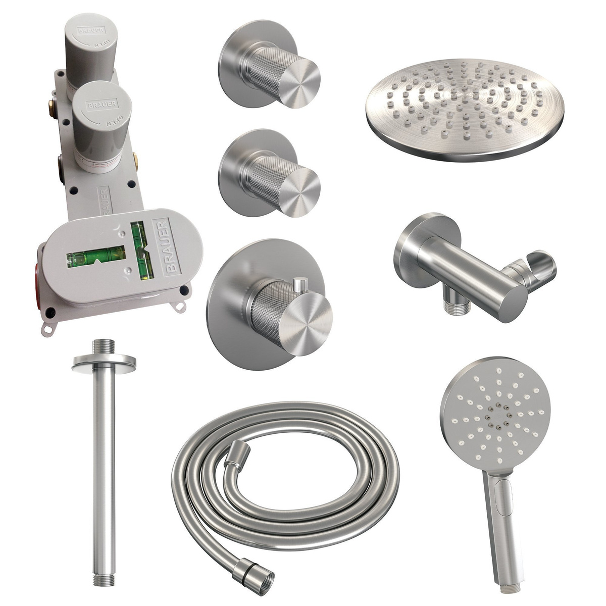 De Brauer Brushed Carving thermostatische inbouw regendouche SET 11 biedt een complete douche-ervaring met een 20 cm douchekop, een plafondarm van 20 cm, een handdouche met 3 standen, een doucheslang en een wandaansluitbocht, allemaal vervaardigd uit hoogwaardig en duurzaam RVS met een geborstelde PVD-afwerking.
