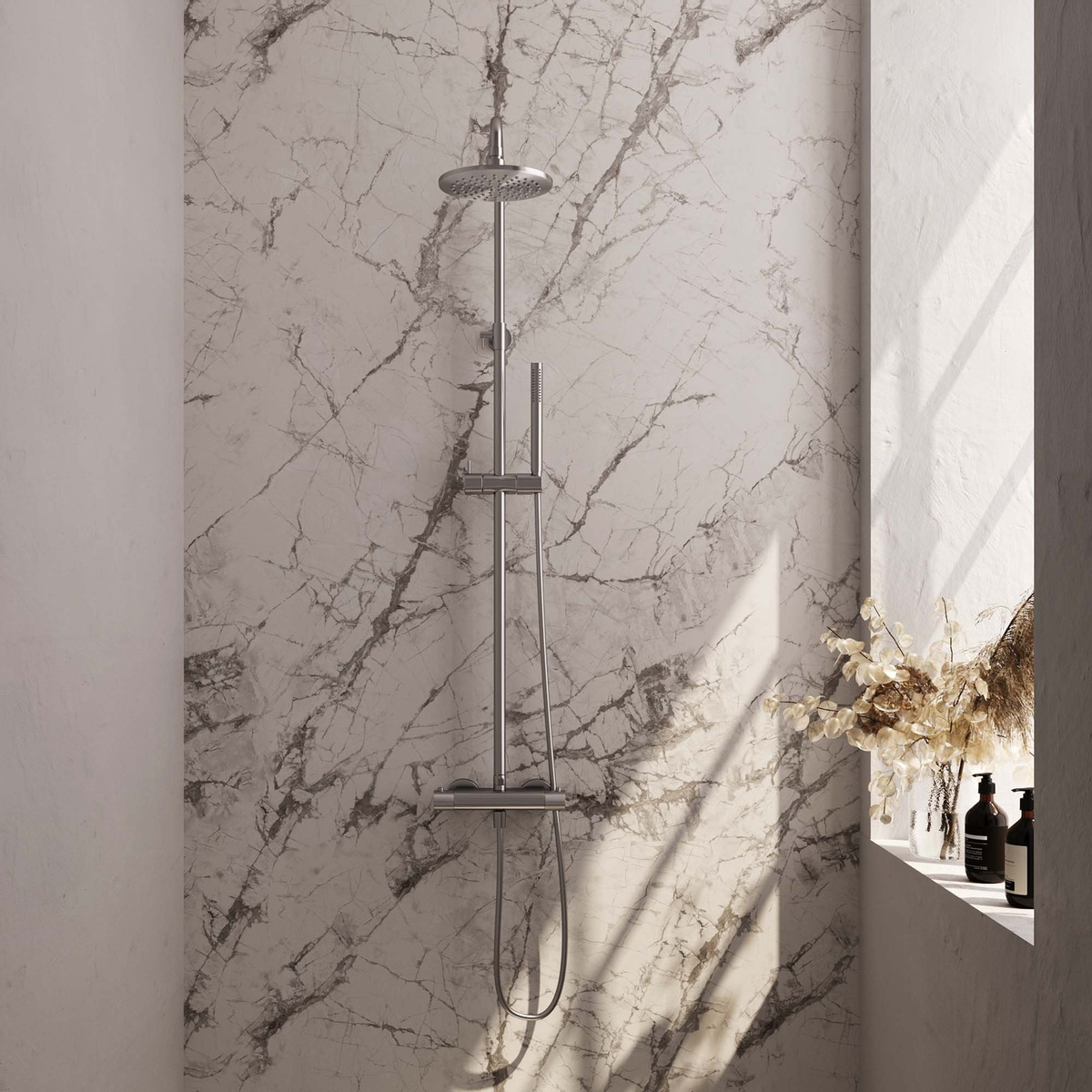 De Brauer Brushed Carving opbouw thermostatische regendouche SET 01 is ontworpen voor comfort en duurzaamheid. Met een 20cm douchekop en een staaf handdouche, kun je genieten van een verfrissende douche-ervaring. De set wordt geleverd met een doucheslang en heeft een geborsteld RVS afwerking met PVD-coating, wat zorgt voor een langdurige en krasbestendige glans.