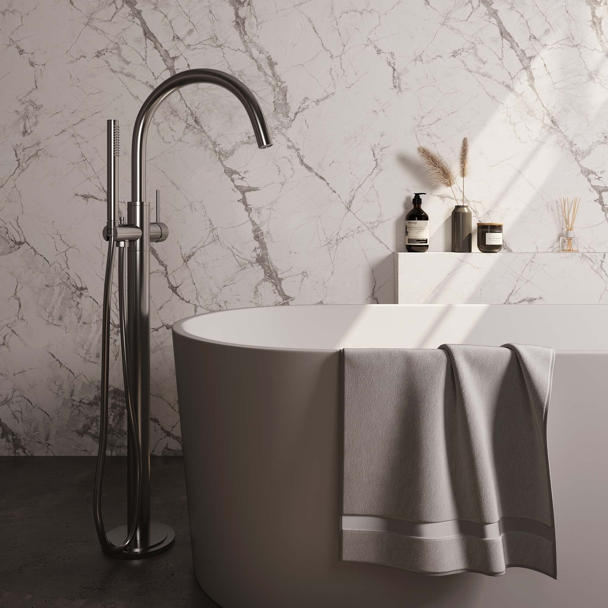 De badkraan wordt geleverd als een complete set, inclusief douchegarnituur, inbouwdeel, rozet, uitloop, houder en handdoucheset. De Brauer Brushed Carving vrijstaande badkraan heeft een hoogte van 100,5 cm. Met één greep kun je de kraan bedienen. Het moderne en chique design van deze vrijstaande badkraan voegt een stijlvolle touch toe aan je badkamer.