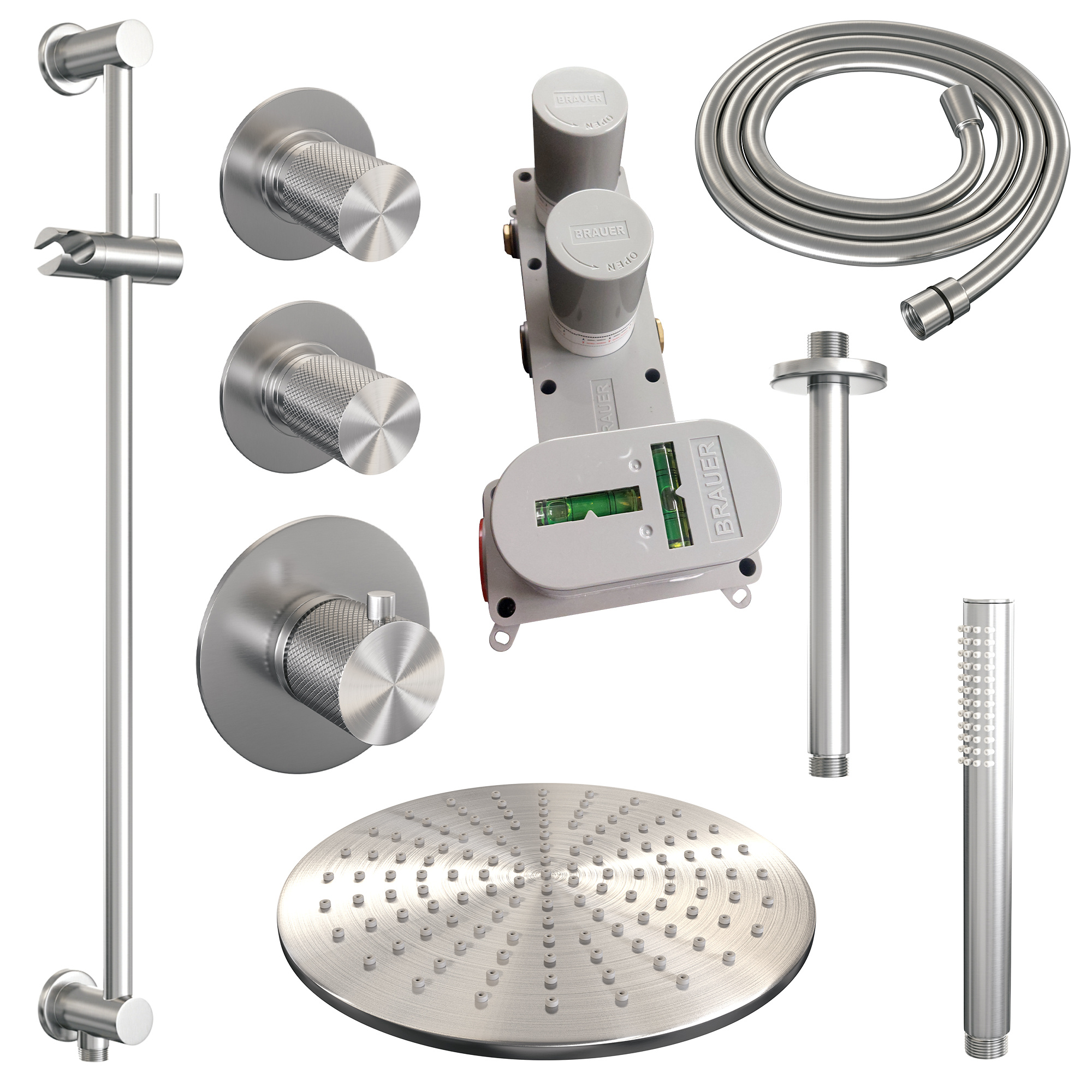 Brauer Brushed Carving Regendoucheset inbouw - hoofddouche 30cm - plafondarm 20cm - 3 carving knoppen - Staafhanddouche - Geborsteld RVS PVD