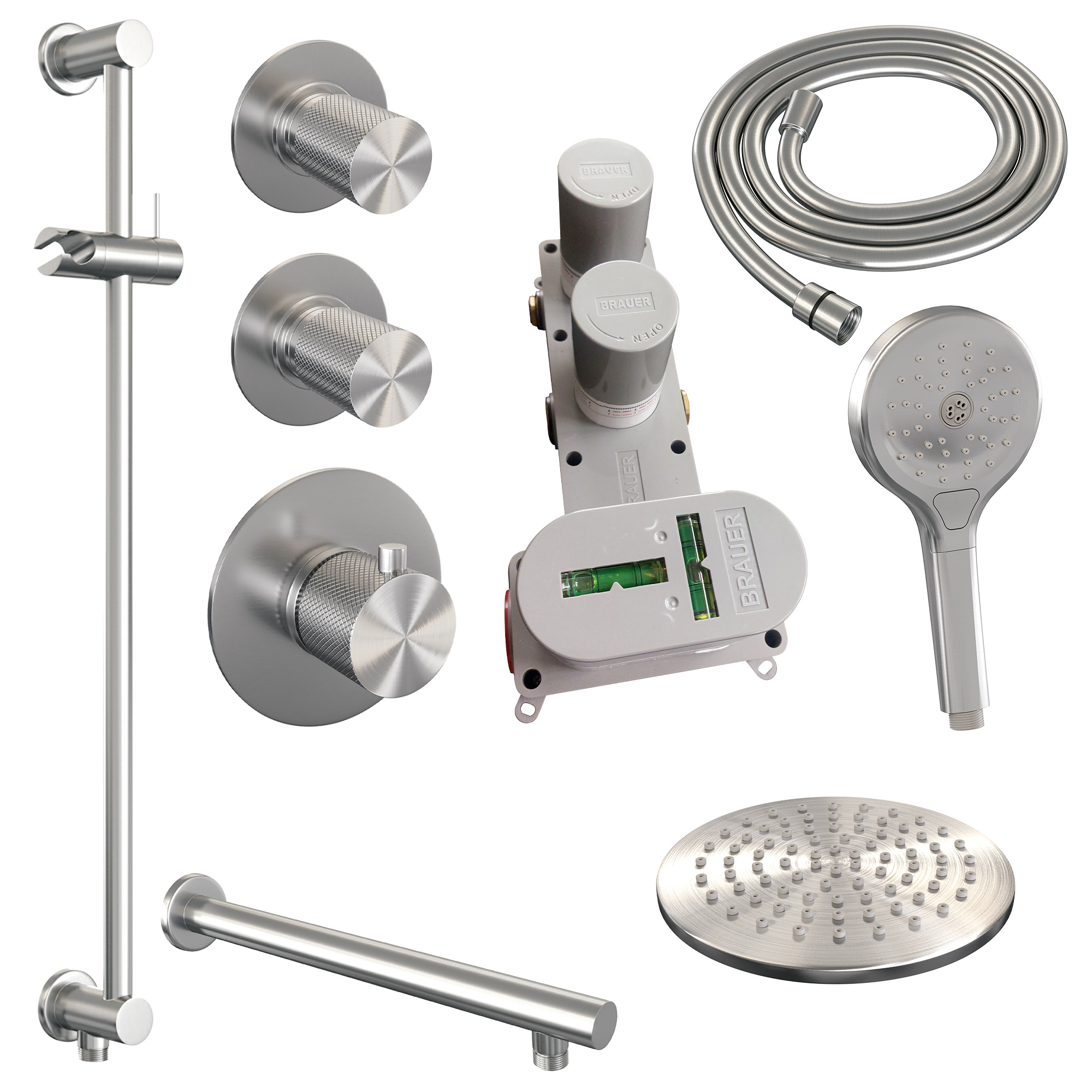 Brauer Brushed Carving Regendoucheset inbouw - hoofddouche 20cm - 3 carving knoppen - rechte wandarm - glijstang - handdouche rond 3 standen - Geborsteld RVS PVD