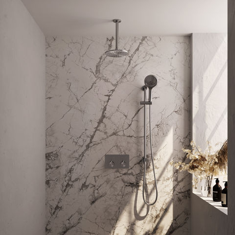Deze Brauer Brushed Carving inbouw regendouche is een complete set voor wie een moderne en functionele douche zoekt. Je krijgt een regendouche met een hoofddouche van 20 cm, een plafondarm, een handdouche met drie standen, een flexibele doucheslang en een geïntegreerde glijstang. Dit systeem is bedoeld voor wie houdt van een strakke uitstraling in de badkamer en graag gebruikmaakt van zowel een hoofddouche als een handdouche. Dankzij de inbouwopstelling blijft je douchewand rustig en opgeruimd.