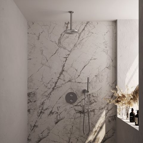 De set is uitgevoerd in RVS geborsteld PVD, wat zorgt voor een matte, krasvaste afwerking. Het materiaal is messing, wat bekend staat om zijn duurzaamheid. De set bevat een ronde hoofddouche van 20 cm die je aan het plafond monteert, en een praktische staaf handdouche met flexibele slang. De thermostaatkraan zorgt ervoor dat de temperatuur constant blijft tijdens het douchen. Deze doucheset is verkrijgbaar in meerdere afwerkingen: chroom, geborsteld goud PVD, geborsteld gunmetal PVD, geborsteld koper PVD, geborsteld RVS PVD en mat zwart. Zo kun je de set afstemmen op de stijl van jouw badkamer.