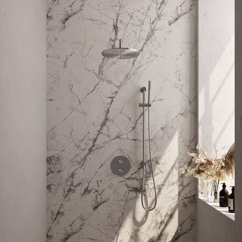 De set is gemaakt van duurzaam messing, wat bekend staat om zijn stevigheid en kwaliteit. De afwerking is RVS geborsteld PVD, wat zorgt voor een matte, krasbestendige laag. Naast deze uitvoering is de set ook verkrijgbaar in andere kleuren zoals chroom, geborsteld goud PVD, geborsteld gunmetal PVD, geborsteld koper PVD en mat zwart. De thermostaat zorgt ervoor dat de watertemperatuur constant blijft tijdens het douchen. Je krijgt een hoofddouche van 30 cm doorsnee, een handdouche, een flexibele doucheslang en een geïntegreerde glijstang. Het inbouwdeel wordt meegeleverd, zodat je meteen alles compleet hebt voor montage. Houd er rekening mee dat deze set niet beschikt over verschillende straalsoorten.