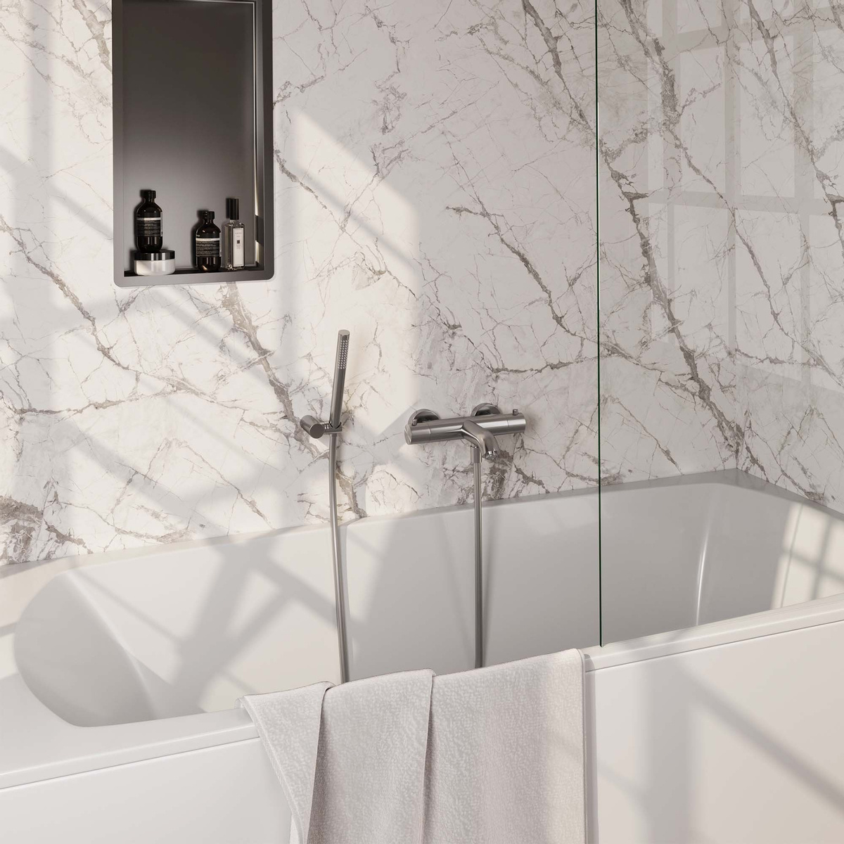Niets werkt zo ontspannend als een warm bad na een lange dag. Daarbij heb je natuurlijk een goede kraan nodig om het bad te vullen. Deze luxe opbouw baddouche thermostaatkraan met handdouchehouder is een topper uit de Brauer Brushed Edition serie. De thermostatische opbouw badkraan bevat een kraan, een baduitloop en een handdoucheset. In combinatie met andere RVS-kleurige elementen van Brauer creëer je een badkamer in jouw eigen stijl!