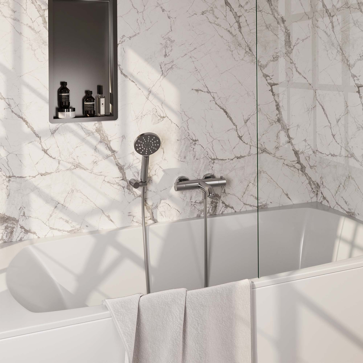 Niets werkt zo ontspannend als een warm bad na een lange dag. Daarbij heb je natuurlijk een goede kraan nodig om het bad te vullen. Deze luxe opbouw baddouche thermostaatkraan met handdouchehouder is een topper uit de Brauer Brushed Edition serie. De thermostatische opbouw badkraan bevat een kraan, een baduitloop en een handdoucheset. In combinatie met andere RVS-kleurige elementen van Brauer creëer je een badkamer in jouw eigen stijl!