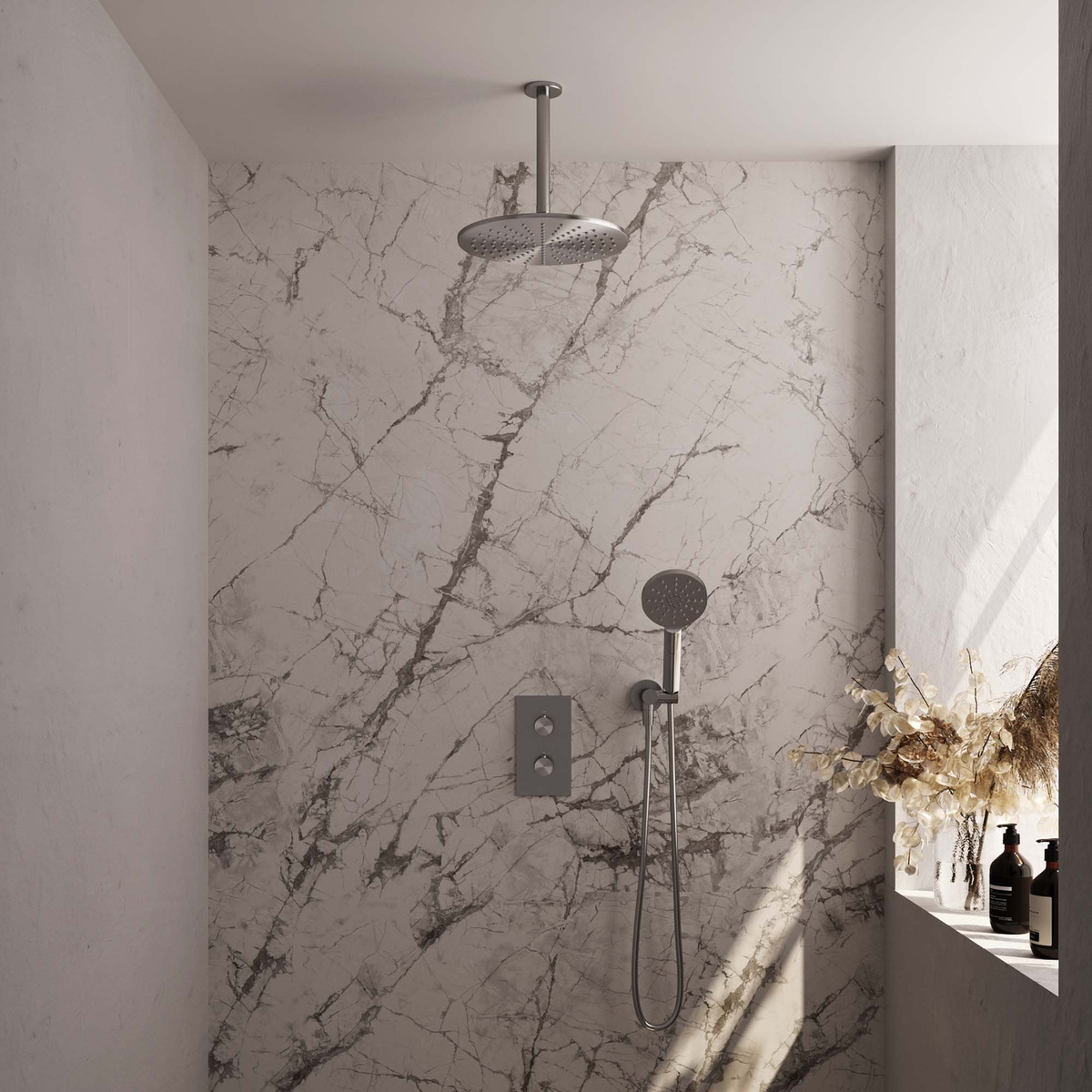 De inbouwthermostaat is eenvoudig te bedienen. Met de onderste knop stel je eenvoudig de gewenste watertemperatuur in, en met de bovenste knop bepaal je de gewenste douchestand en switch je tussen hoofd- en handdouche.