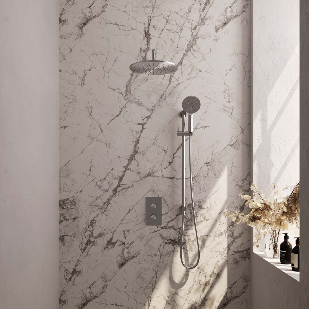 Deze complete doucheset is voorzien van alle gemakken. Met de omstel thermostaat kun je eenvoudig de gewenste watertemperatuur instellen. Met de gladde knop bepaal je de gewenste douchestand en schakel je moeiteloos tussen de hoofddouche van 30 cm en de handdouche met rond design en 3 standen. De set wordt compleet geleverd met een glijstang voor optimale flexibiliteit en comfort.