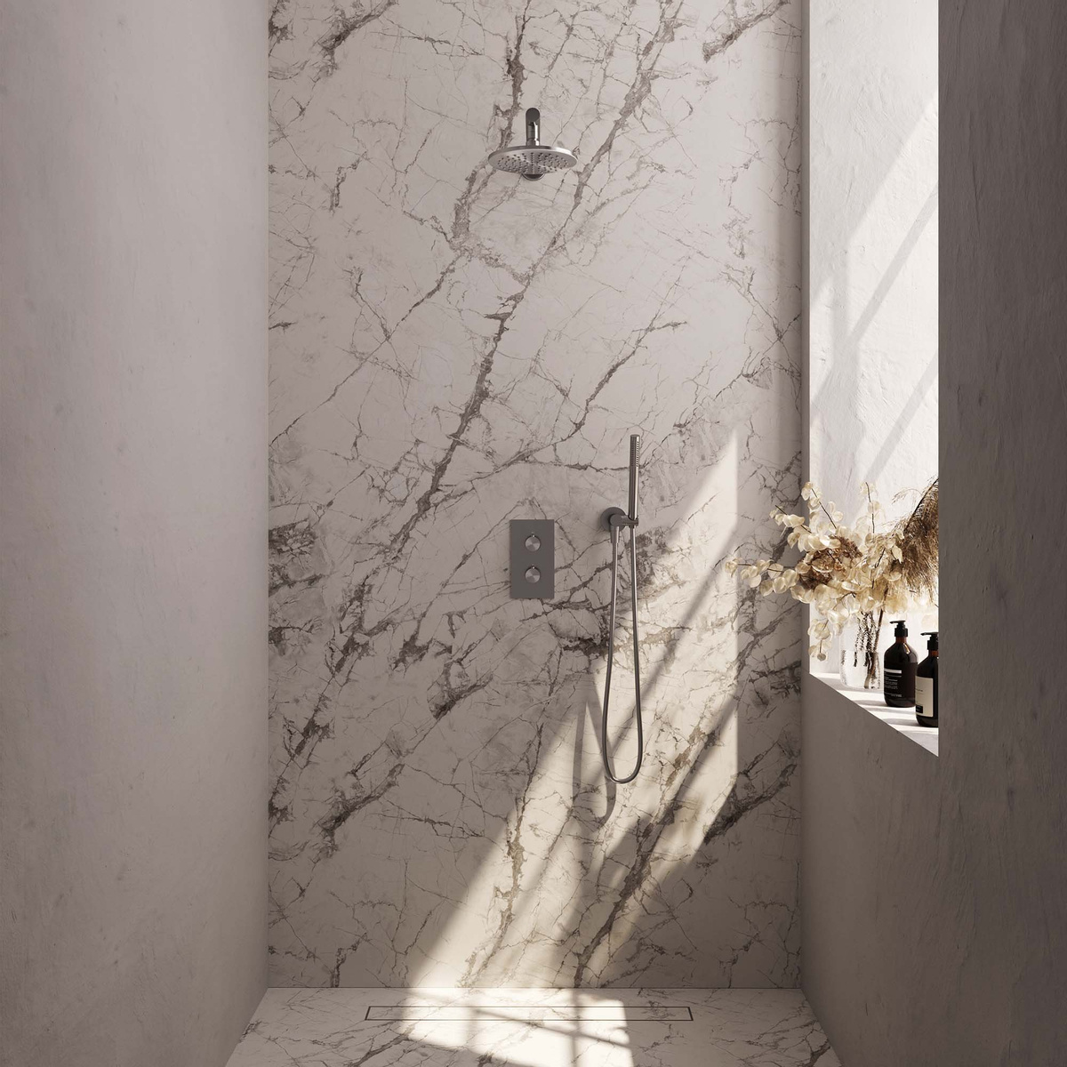- Alle functionele onderdelen van deze regendoucheset zijn in de muur verwerkt. Dit zorgt voor een strakke en luxe uitstraling.
