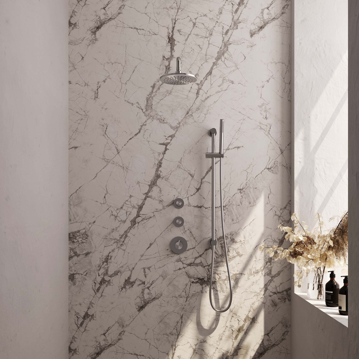- Eenvoudige bediening dankzij de inbouwthermostaat met grote knop voor watertemperatuur en kleinere knoppen voor hoofd- en handdouche