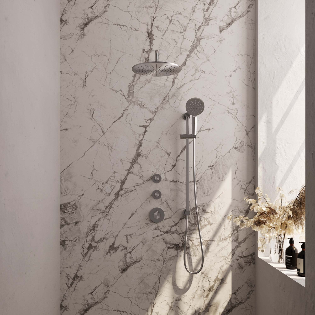 De inbouwthermostaat is eenvoudig te bedienen. Met de grote knop stel je de gewenste watertemperatuur in, en met de kleinere knoppen bedien je de hoofd- en handdouche.