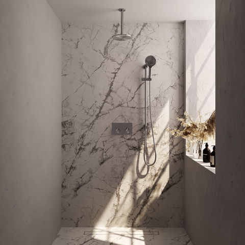 De set is gemaakt van messing, een materiaal dat bekend staat om zijn stevigheid. De afwerking is RVS geborsteld PVD, wat zorgt voor een matte, moderne look en extra bescherming tegen slijtage. Je bedient de douche via intuïtieve drukknoppen, waarmee je eenvoudig wisselt tussen de hoofddouche en de handdouche, of beide tegelijk gebruikt. De handdouche heeft drie standen, zodat je zelf de straal kiest die je prettig vindt. De set wordt compleet geleverd met een 20 cm hoofddouche, plafondarm, glijstang en doucheslang. Je kunt kiezen uit verschillende kleuropties, zoals chroom, geborsteld goud PVD, geborsteld gunmetal PVD, geborsteld koper PVD, geborsteld RVS PVD en mat zwart.