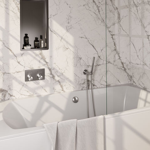 De kraan is uitgevoerd in RVS geborsteld PVD, wat zorgt voor een matte en krasbestendige afwerking. Dankzij de thermostaat blijft de watertemperatuur constant, wat prettig is tijdens het douchen of baden. De bediening werkt via drukknoppen, waarmee je eenvoudig en intuïtief tussen de verschillende wateruitgangen schakelt. Het inbouwdeel wordt standaard meegeleverd, zodat alle benodigde onderdelen aanwezig zijn voor de montage. Deze set is verkrijgbaar in meerdere afwerkingen: chroom, geborsteld goud PVD, geborsteld gunmetal PVD, geborsteld koper PVD, geborsteld RVS PVD en mat zwart. Zo kun je de kraan afstemmen op de rest van jouw badkamer.