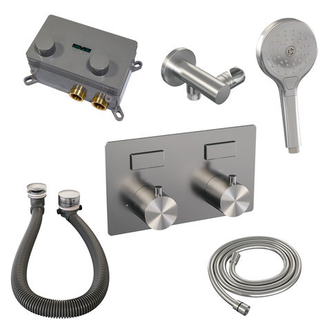 Brauer Brushed Edition thermostatische inbouw badkraan met drukknoppen SET 04 met badvulcombinatie en 3-standen handdouche en doucheslang en wandaansluitbocht RVS geborsteld PVD | Geborsteld RVS | Ronde Handdouche