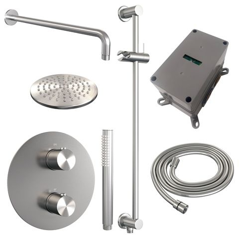 Brauer Brushed Edition thermostatische inbouw regendouche 3-weg rond SET 87 | Geborsteld RVS | 20 cm | Ja | Gebogen wandarm | Staafhanddouche