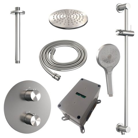 Brauer Brushed Edition thermostatische inbouw regendouche 3-weg rond SET 95 | Geborsteld RVS | 20 cm | Ja | Plafondbuis | Ronde handdouche