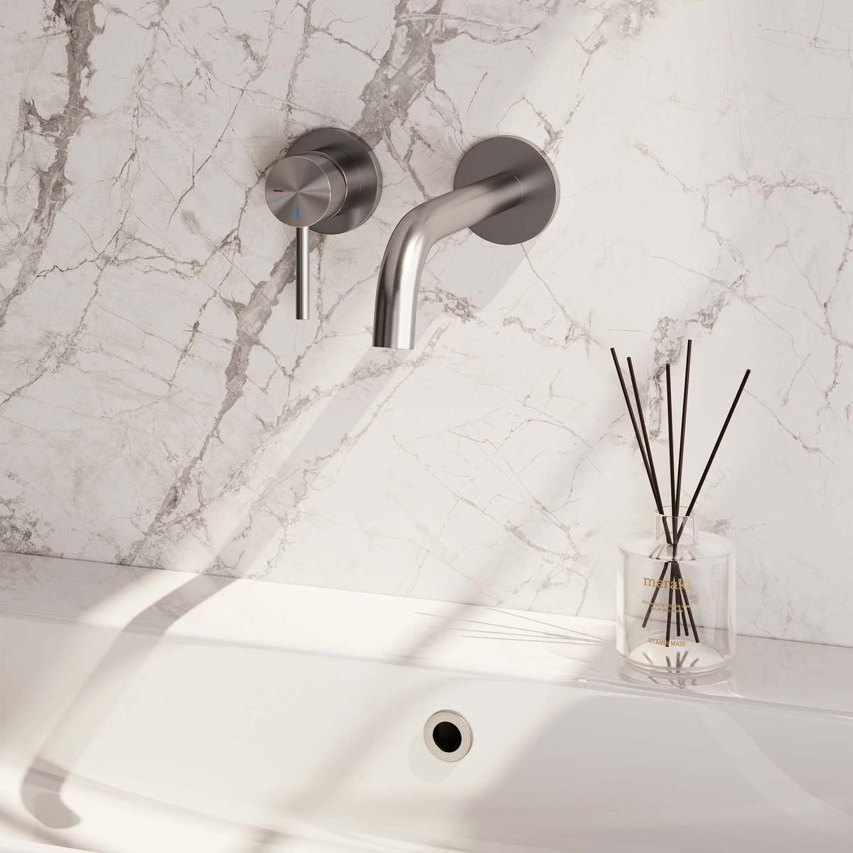 De Brauer Brushed Edition Wastafelmengkraan heeft een gebogen uitloop aan de rechterkant en een lang, smal hendelontwerp. Deze kraan wordt ingebouwd in de wand, waardoor alleen de uitloop en de hendel zichtbaar zijn. Dit geeft een strak en opgeruimd uiterlijk aan je badkamer. Het inbouwdeel en de benodigde rozetten zijn inbegrepen voor een eenvoudige installatie.
