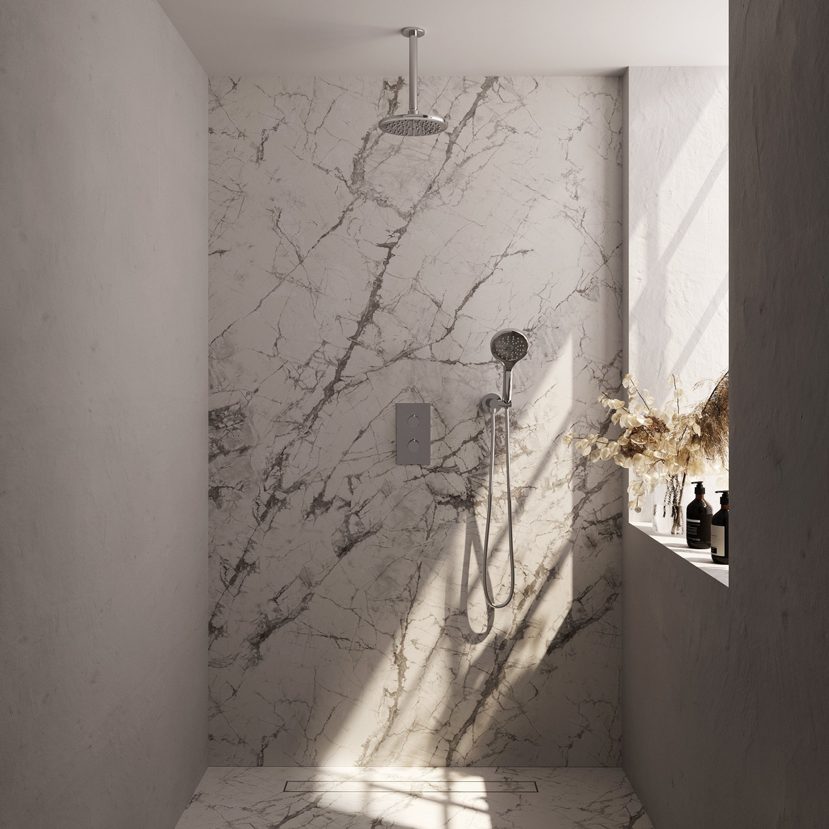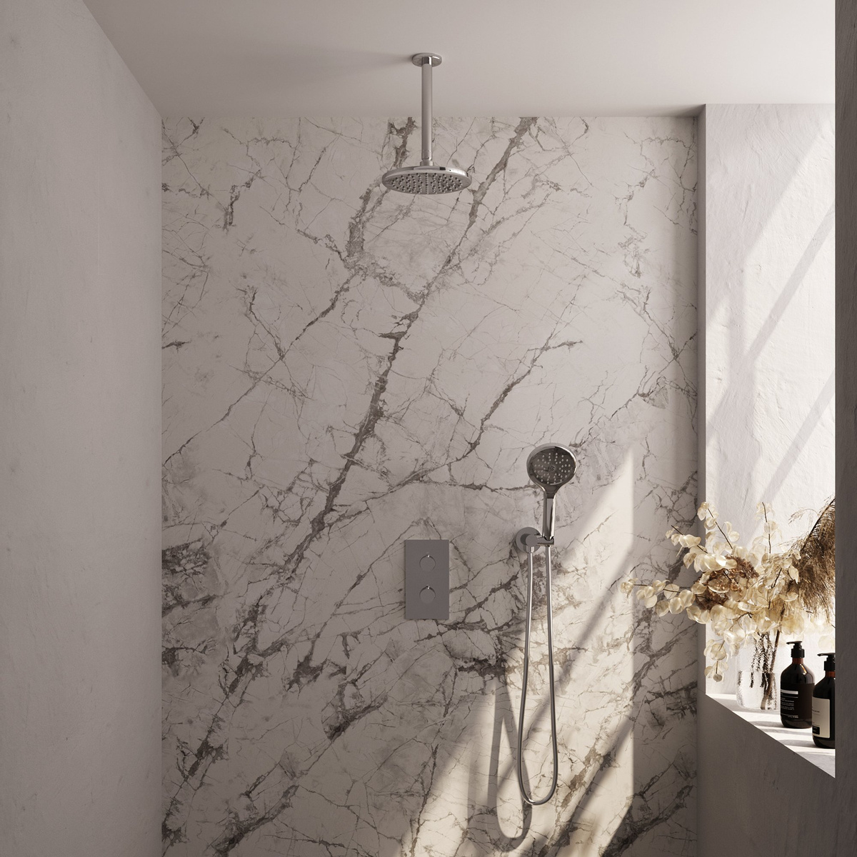 De thermostatische inbouw regendouche biedt maar liefst 3 functies met een handige omstelling. Hiermee kun je eenvoudig schakelen tussen de hoofddouche, de handdouche en de combinatie van beide. Daarnaast is de handdouche voorzien van 3 verschillende standen, zodat je kunt kiezen voor de perfecte waterstraal die bij jouw voorkeur past.