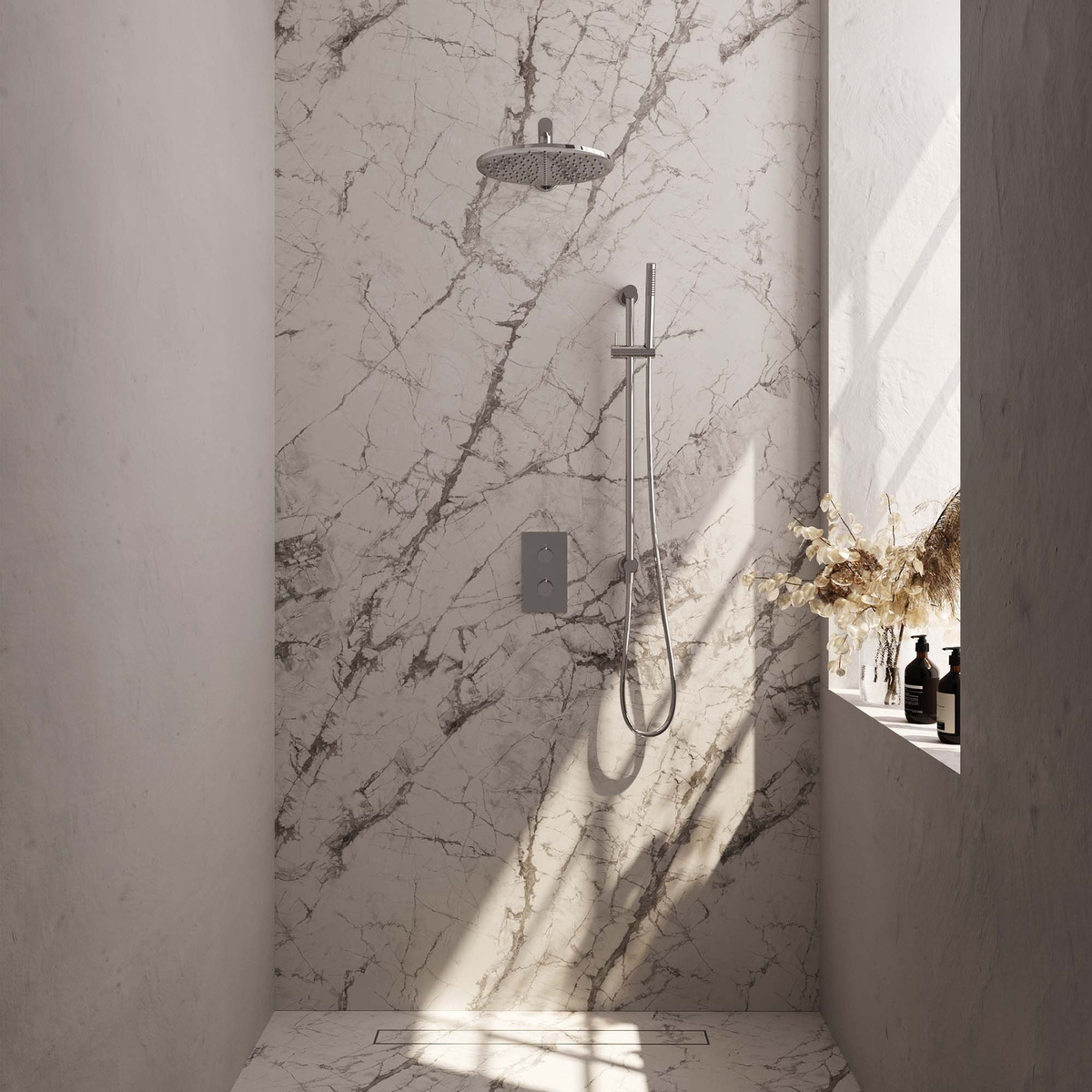 Met zijn strakke chroom afwerking voegt deze doucheset een moderne touch toe aan jouw badkamer. De carving knop geeft de doucheset een unieke uitstraling en maakt het gemakkelijk om de gewenste watertemperatuur en waterstraal in te stellen. De Brauer Chrome Carving Regendoucheset inbouw is de perfecte keuze voor liefhebbers van een eigentijds design.