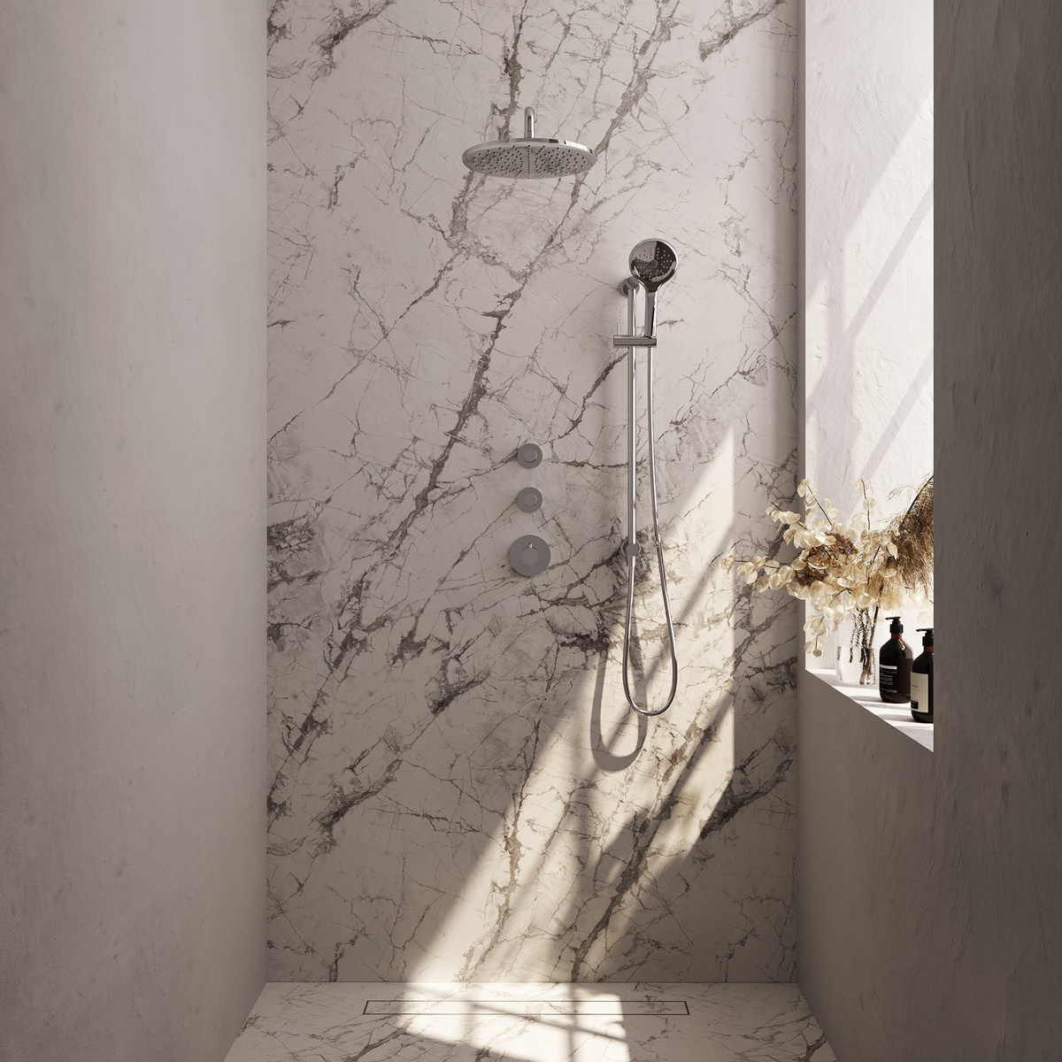 Met de Brauer Chrome Carving thermostatische inbouw regendouche SET 22 geniet je van de perfecte balans tussen stijl en functionaliteit. Deze set bevat een 30cm douchekop, een gebogen muurarm, een 3-standen handdouche en een doucheslang. De geïntegreerde glijstang zorgt voor een moeiteloze aanpassing van de hoogte en de positie van de handdouche. De chroom afwerking voegt een vleugje elegantie toe aan je badkamerinterieur.