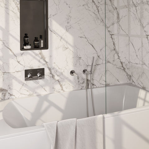 Deze Brauer Chrome Carving thermostatische inbouw badkraan is bedoeld voor wie op zoek is naar een moderne en praktische oplossing voor het bad. Je kiest hiermee voor een kraan die strak in de wand wordt ingebouwd, waardoor je badkamer rustig en opgeruimd oogt. De bediening gaat via drukknoppen, wat je eenvoudig en prettig vindt in het dagelijks gebruik. Dankzij de thermostaat kun je rekenen op een constante watertemperatuur, wat prettig is als je graag comfortabel en veilig wilt baden of douchen. Met deze set haal je niet alleen een badkraan in huis, maar ook een handdouche, doucheslang en wandaansluitbocht, zodat je direct alles compleet hebt.