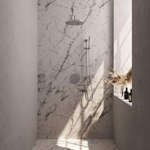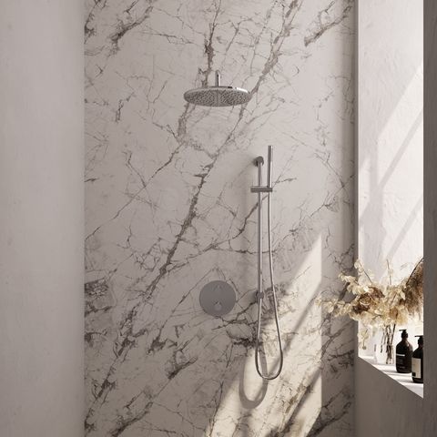 De set is uitgevoerd in chroom, wat zorgt voor een tijdloze en neutrale afwerking die in vrijwel elk badkamerontwerp past. Het materiaal is messing, bekend om zijn stevigheid en duurzaamheid. De thermostaat zorgt ervoor dat het water snel op temperatuur blijft, wat prettig is voor comfort en veiligheid. De set is een 3-weg inbouwmodel: je kunt kiezen tussen de hoofddouche, de handdouche of een derde uitgang, maar niet meerdere tegelijk gebruiken. De set bevat een gebogen muurarm voor de hoofddouche, een flexibele doucheslang en een geïntegreerde glijstang, zodat je de handdouche makkelijk in hoogte verstelt. Naast chroom is deze set verkrijgbaar in geborsteld goud PVD, geborsteld gunmetal PVD, geborsteld koper PVD, geborsteld RVS PVD en mat zwart.