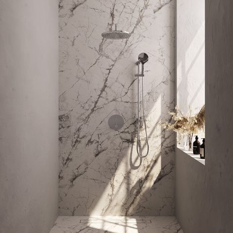 Deze doucheset is uitgevoerd in chroom, wat zorgt voor een tijdloze uitstraling die makkelijk te combineren is met andere badkameraccessoires. Het product is gemaakt van duurzaam messing, wat bekend staat om zijn kwaliteit. De set bestaat uit een grote hoofddouche, een praktische handdouche met drie verschillende straalsoorten en een flexibele doucheslang. Met één druk op de knop wissel je eenvoudig tussen de straalsoorten. De geïntegreerde glijstang maakt het mogelijk om de handdouche op de gewenste hoogte te plaatsen. De thermostaat zorgt voor een constante watertemperatuur tijdens het douchen. Het inbouwdeel wordt meegeleverd, wat de montage overzichtelijk maakt. Naast chroom is deze set verkrijgbaar in meerdere afwerkingen, zoals geborsteld goud PVD, geborsteld gunmetal PVD, geborsteld koper PVD, geborsteld RVS PVD en mat zwart.