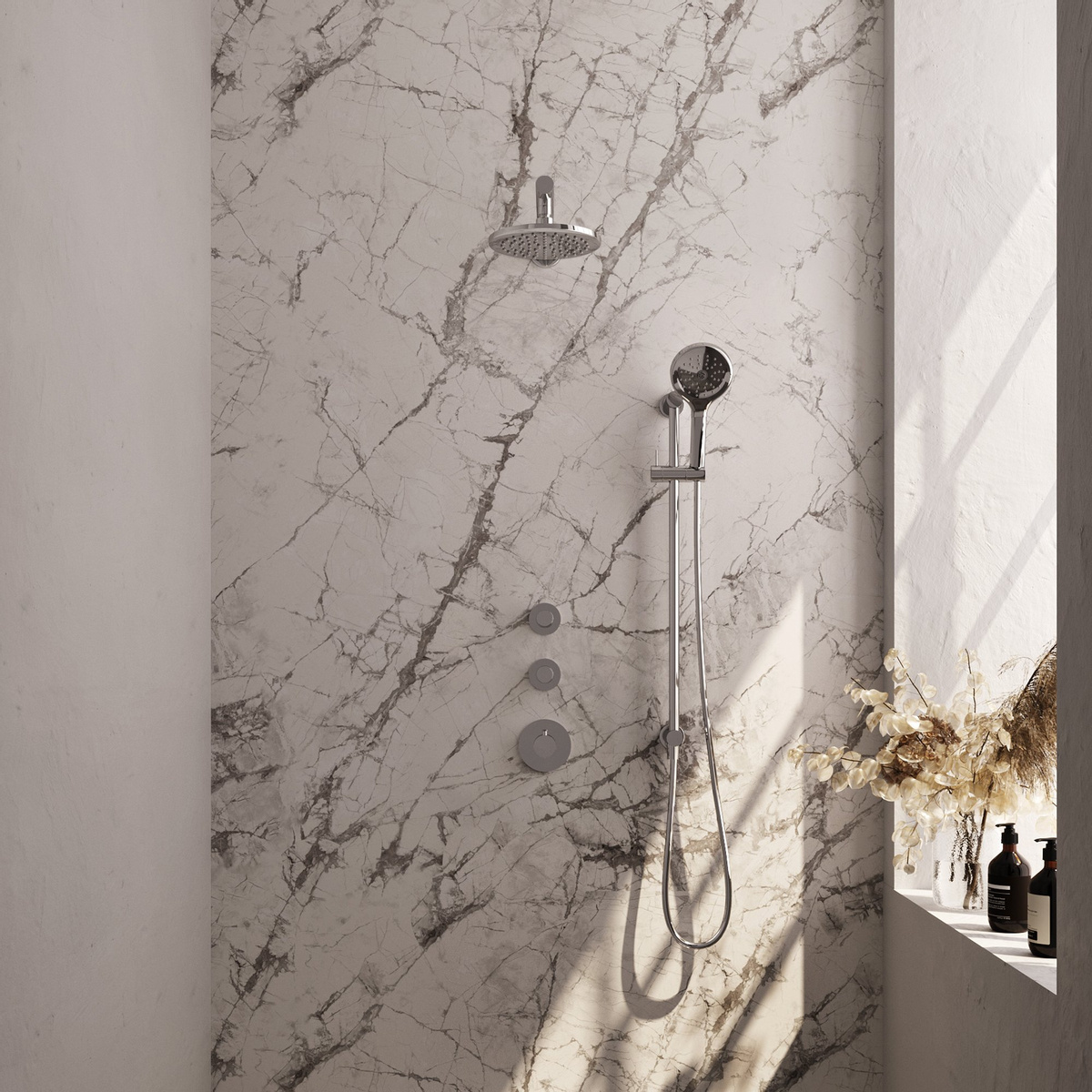 Deze inbouw regendoucheset biedt niet alleen gebruiksgemak, maar ook eenvoudige bediening. Met de grote knop stel je moeiteloos de gewenste watertemperatuur in, terwijl de kleinere knoppen de hoofd- en handdouche bedienen.