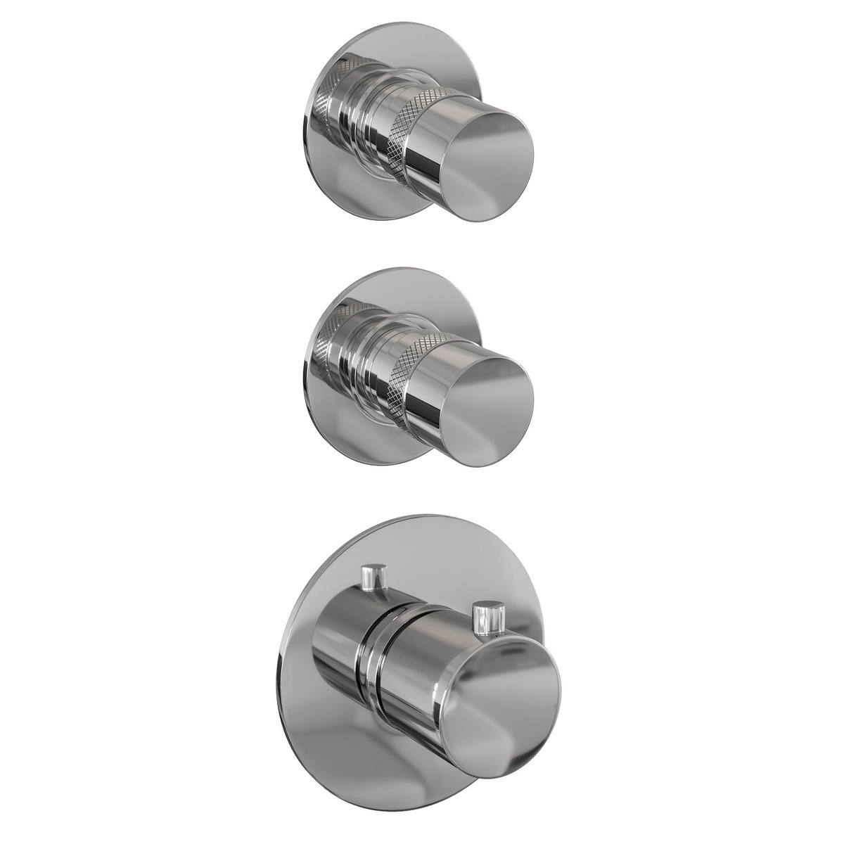 De inbouwthermostaat van deze regendoucheset is eenvoudig te bedienen. Met de grote knop stel je moeiteloos de gewenste watertemperatuur in, en met de kleinere knoppen bedien je zowel de hoofd- als handdouche.