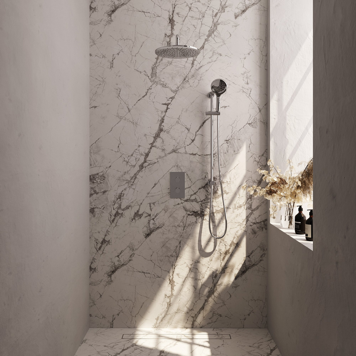- Alle functionele onderdelen van deze regendoucheset zijn in de muur verwerkt, wat zorgt voor een strakke en luxe uitstraling.