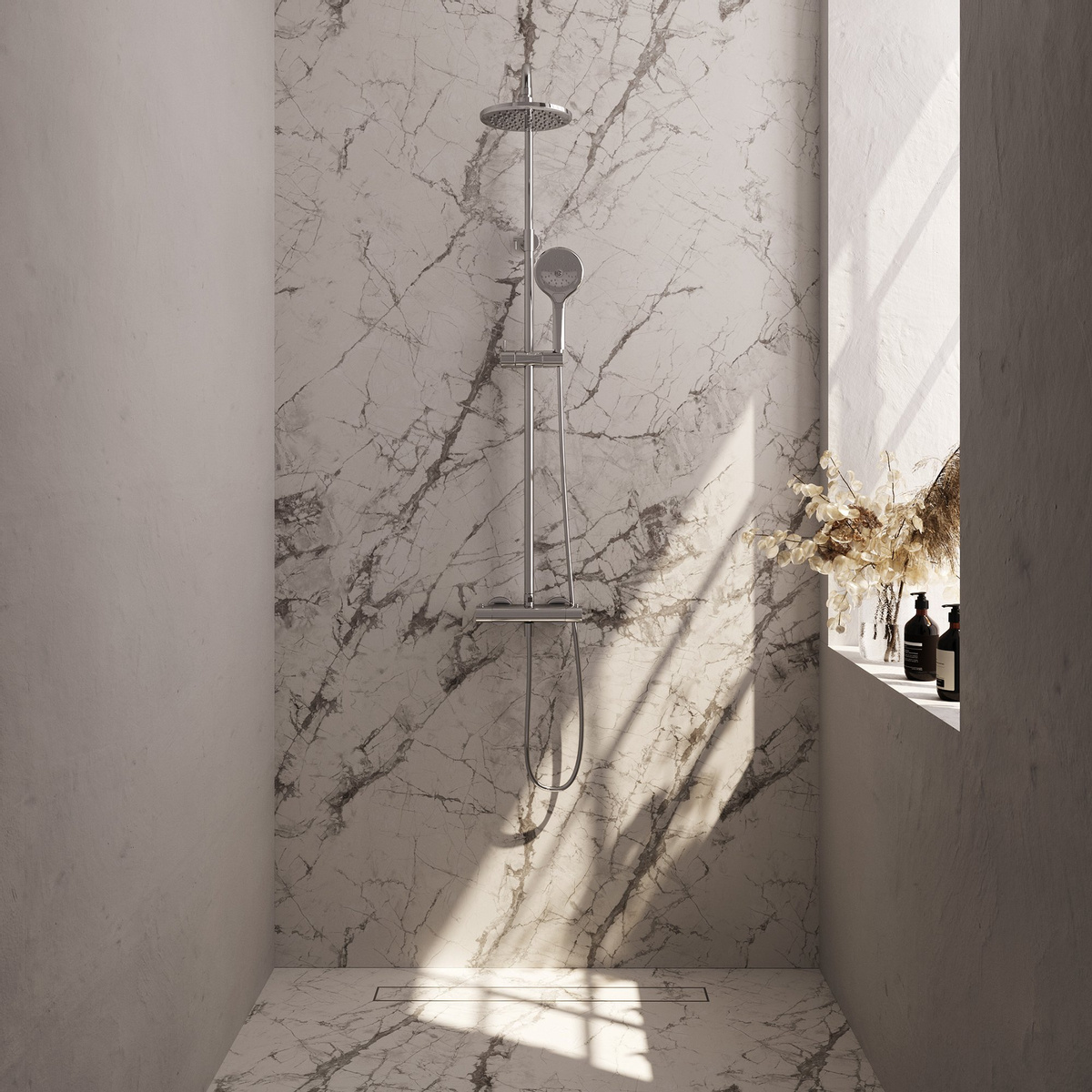 Deze opbouw regendoucheset wordt geleverd met een thermostaatkraan, waarmee je eenvoudig kunt douchen met de juiste temperatuur. Een thermostatische kraan bespaart ongemerkt veel water. Bij conventionele kranen moet je handmatig warm en koud water mengen om de gewenste temperatuur te bereiken, wat leidt tot onnodig waterverbruik. Met een thermostatische kraan kun je in één keer de juiste watertemperatuur instellen zonder liters water te verspillen.