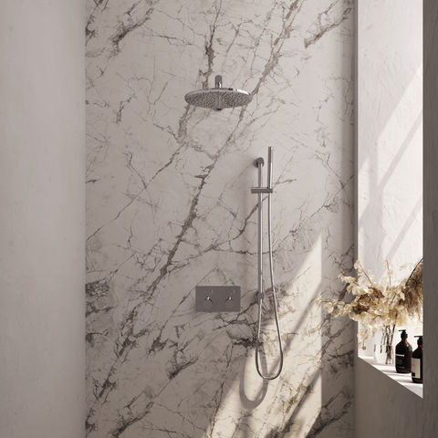 De set is uitgevoerd in chroom, een afwerking die tijdloos is en goed past in verschillende badkamerstijlen. Het gebruikte materiaal is messing, wat bekend staat om zijn degelijkheid. De thermostaat zorgt ervoor dat de temperatuur van het water constant blijft, wat prettig is tijdens het douchen. Je bedient de set via drukknoppen, wat intuïtief werkt en een moderne uitstraling geeft. De hoofddouche heeft een doorsnede van 30 cm, waardoor je een ruime waterstraal krijgt. De handdouche en glijstang maken het mogelijk om flexibel te douchen of de douchekop op de gewenste hoogte te zetten. De set is verkrijgbaar in meerdere afwerkingen, zoals geborsteld goud PVD, geborsteld gunmetal PVD, geborsteld koper PVD, geborsteld RVS PVD en mat zwart, zodat je kunt kiezen wat het beste bij jouw badkamer past.