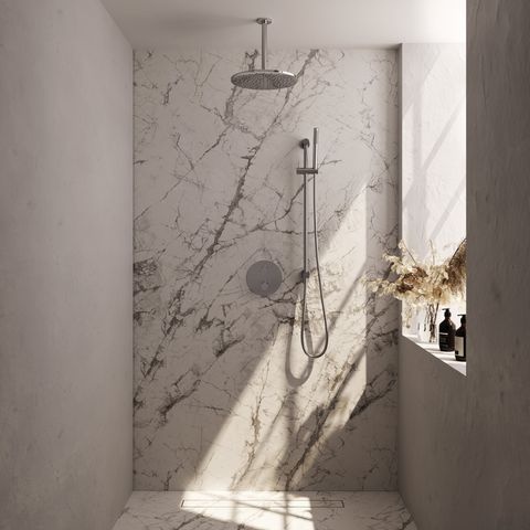 De set is uitgevoerd in chroom, wat zorgt voor een neutrale en tijdloze afwerking die in vrijwel elke badkamer past. Het materiaal is messing, wat bekend staat om zijn degelijkheid. De set bestaat uit een grote hoofddouche voor een ruime waterstraal, een handdouche voor flexibel gebruik en een glijstang waarmee je de handdouche eenvoudig op de juiste hoogte zet. De thermostaat zorgt ervoor dat het water niet onverwacht warmer of kouder wordt. Alles wat je nodig hebt voor de installatie is inbegrepen, inclusief het inbouwdeel. Deze doucheset is verkrijgbaar in meerdere afwerkingen, zoals geborsteld goud PVD, geborsteld gunmetal PVD, geborsteld koper PVD, geborsteld RVS PVD en mat zwart, zodat je kunt kiezen wat het beste bij jouw badkamer past.