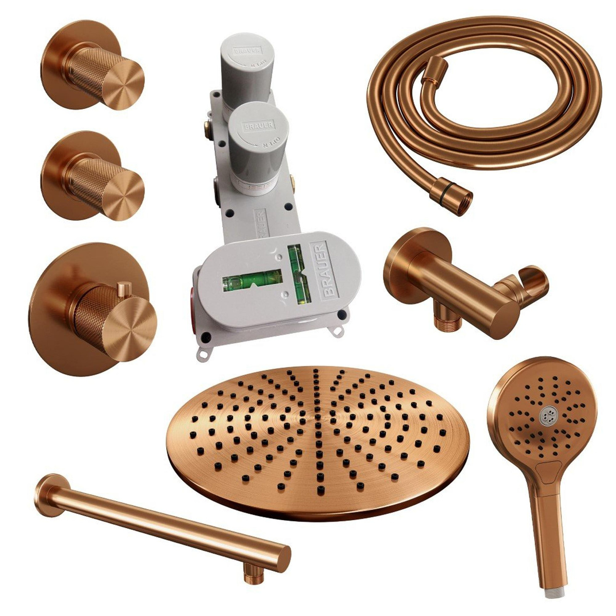 Brauer Copper Carving Regendoucheset inbouw - hoofddouche 30cm - 3 carving knoppen - rechte wandarm - handdouche rond 3 standen - Geborsteld koper PVD