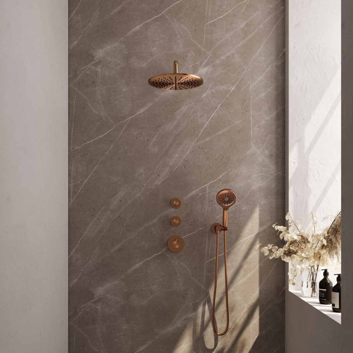 De Brauer Copper Carving Regendoucheset combineert functionaliteit met een stijlvol design. Het geborsteld koperen materiaal voegt een warme en luxueuze uitstraling toe aan je badkamer. De Carving knoppen zorgen voor een moeiteloze aanpassing van de watertemperatuur, terwijl de handdouche met 3 standen je de mogelijkheid biedt om de gewenste waterstraal te kiezen.