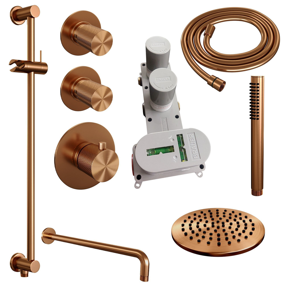 Brauer Copper Carving Regendouchesets inbouw - hoofddouche 20cm - Wandarm - glijstang - met inbouwdeel - Carving knoppen - handdouche Staaf 1 stand - PVD - geborsteld koper