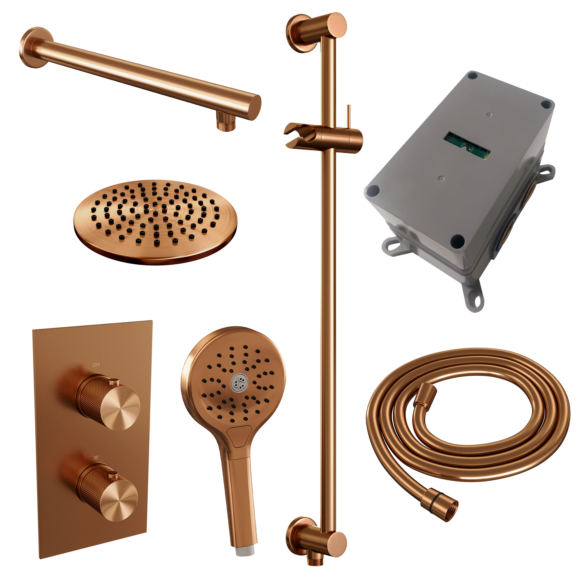 Brauer Copper Carving thermostatische inbouw regendouche | Geborsteld koper PVD | 20 cm | Ja | Rechte wandarm | Ronde Handdouche